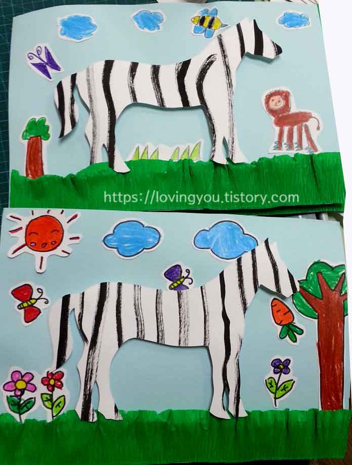 얼룩말 모양을 도화지에 대고 오린 후 본을 만들어 줍니다. 붓으로 선을 그려줍니다.