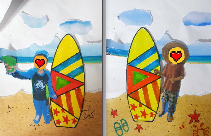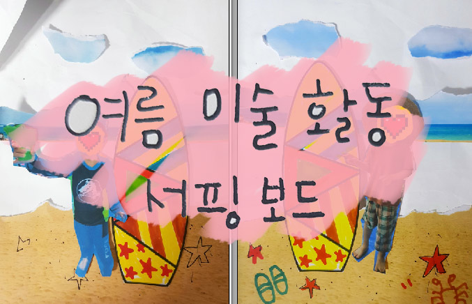 여름 물놀이 해변가 미술활동작품으로 서핑보드를 색칠하여 유아들의 사진으로 꾸며 보았습니다.