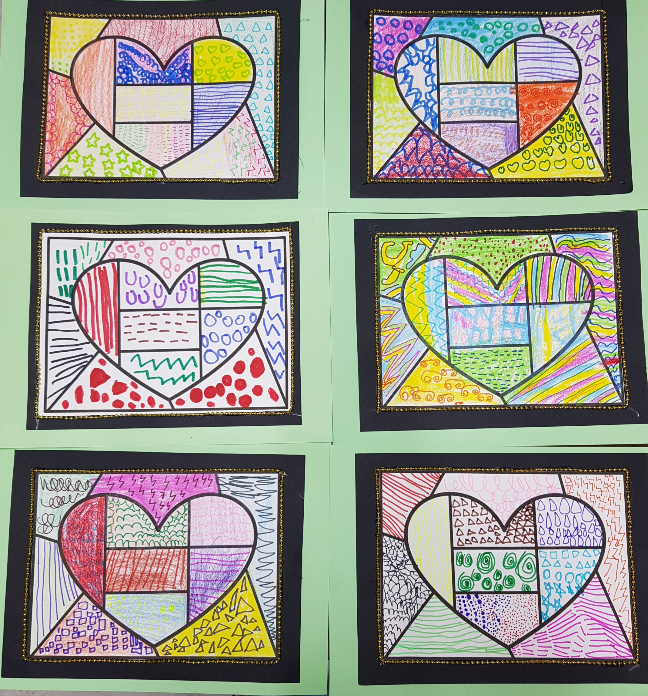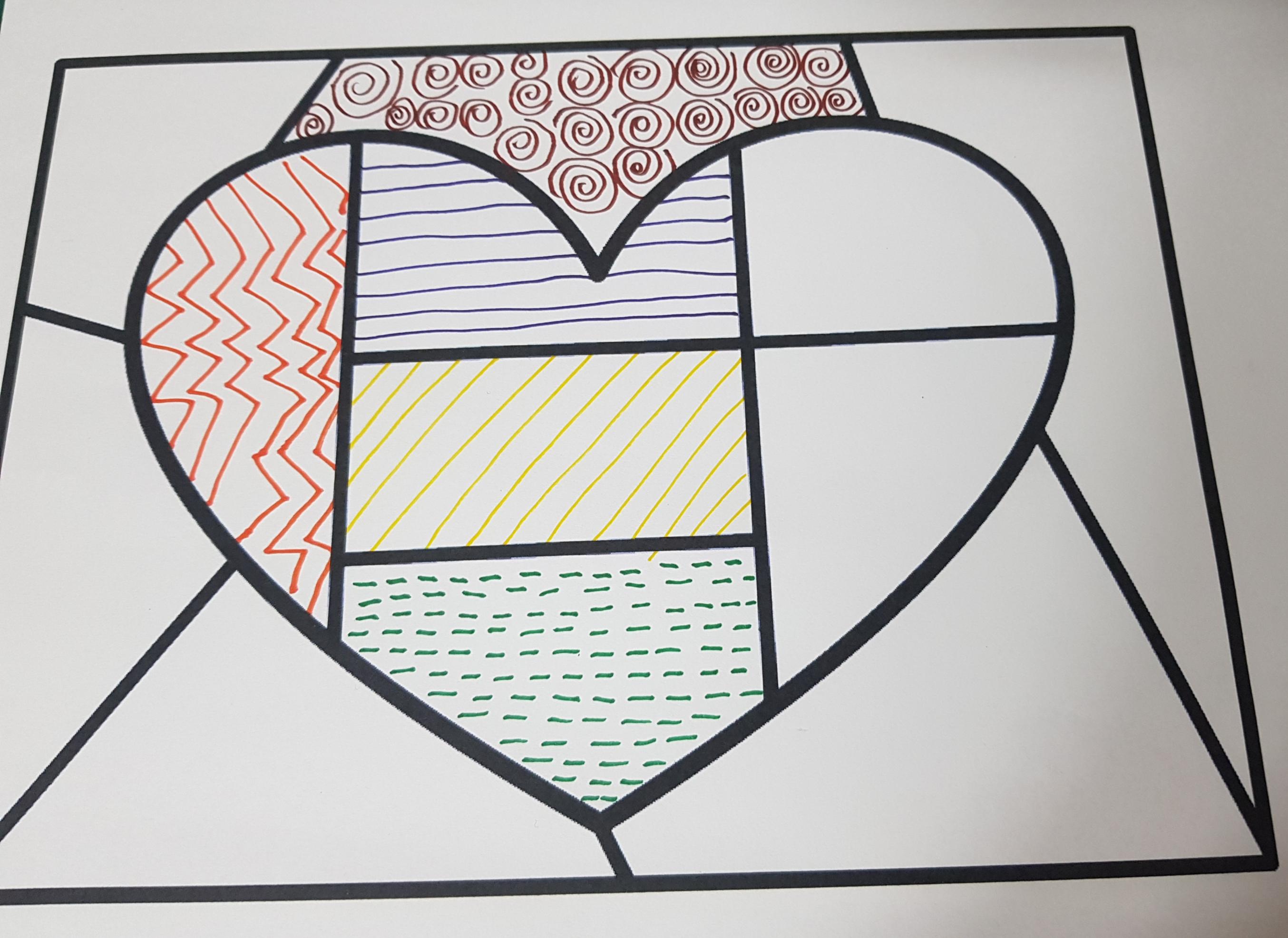 오늘 활동으로 하트 스테인 글라스 , 하트 몬드리안 도안안에 유아들의 다양한 무늬나 선, 점을 통해 표현해보는 시간을