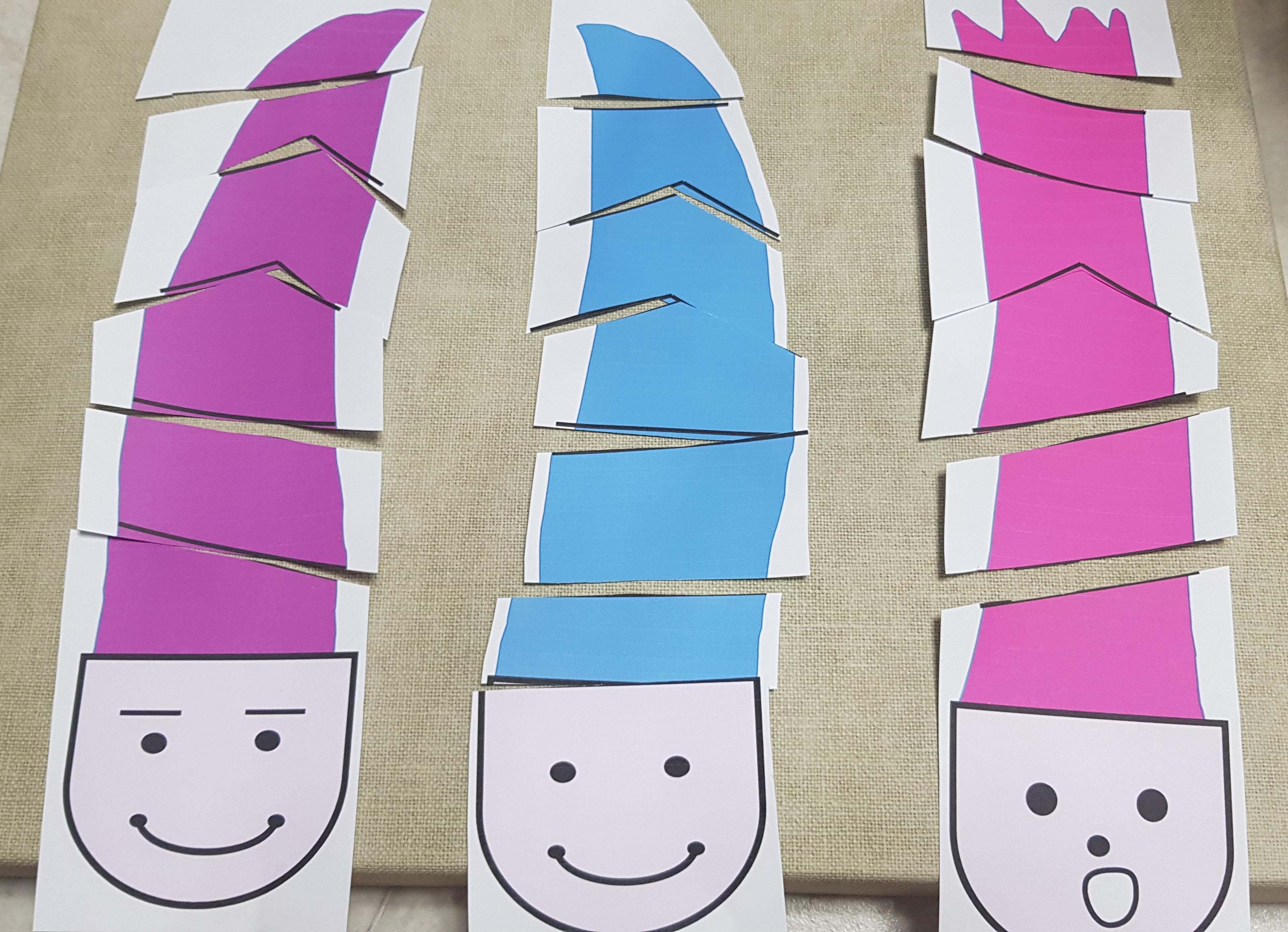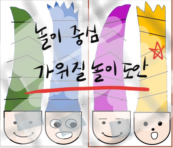 가위질을 하면서 표정, 색깔, 머리길이 숫자세기 등 여러 주제로 확장하여 이야기 나누어 볼수 있습니다.