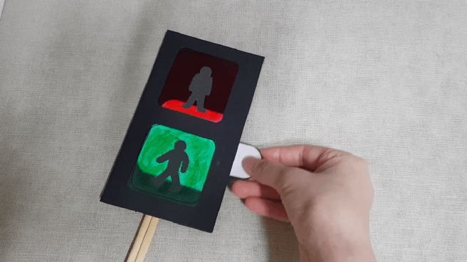 네모난 손잡이를 가위로 오려서 옆면을 벌려 끼워주세요. 그럼 진짜 불빛을 킨듯한 신호등이 완성이 됩니다.