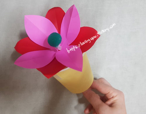 종이컵속에 있는 빨대를 위로 아래로 잡아당기면 꽃이 활짝 피어요