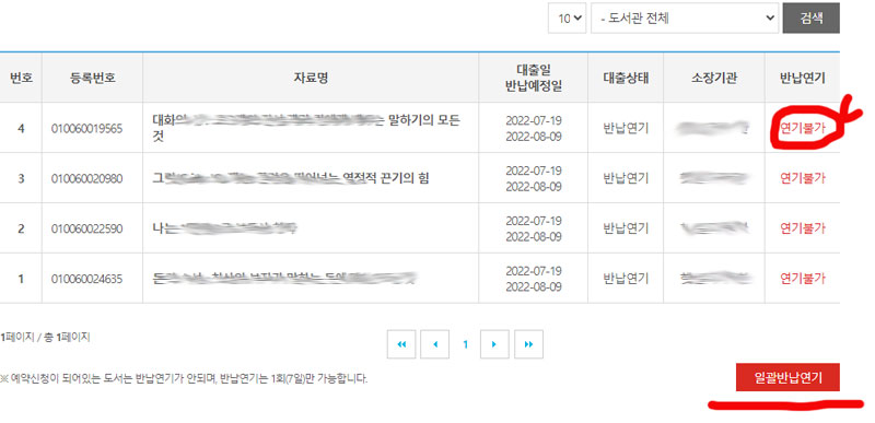마이페이지 클릭 하시고, 위 화면처럼 오른쪽 반납연기 눌러주시면 됩니다.