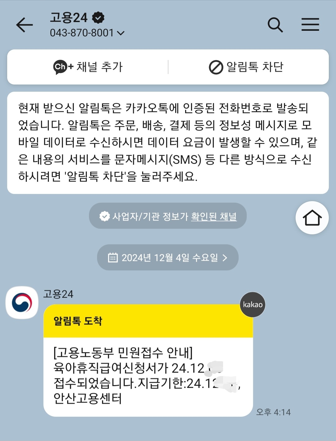 그리고 육아 휴직급여 신청후 서류 심사후 확인이 카톡으로 이상이 있다면 고용보험에서 직접 전화가 옵니다.