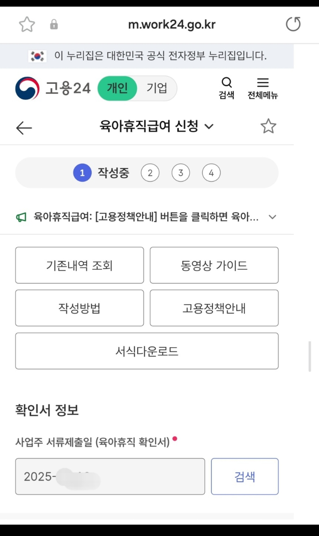 자동으로 육아 휴직 확인서가 떠 있습니다.