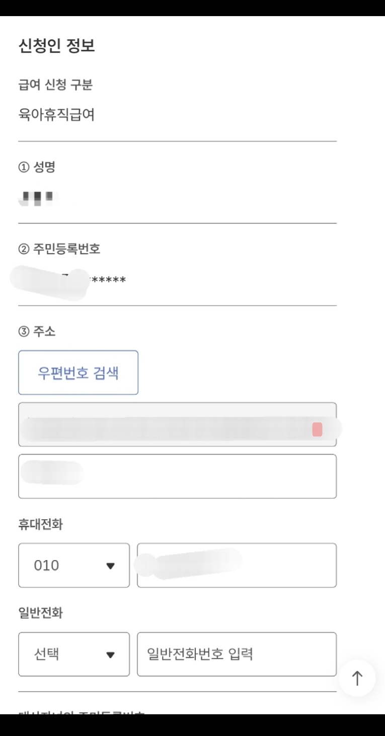 신청인 정보 성명, 주민등록번호, 주소 ,휴대전화를 입력합니다.