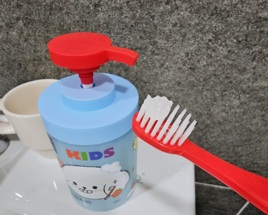 키즈, 어린이들이 쉽게 빨간 중앙부를 누르면 치약이 나와서 쉽게 사용할수 있습니다. 직접 짜서 사용하는 튜브형의 치약의 경우에는 너무 세게 눌러 양이 넘치거나 조절이 안되다 보니 장난을 치는 경우가 많기도하고, 뚜껑에도 치약이 범벅이되어서 일일히 닦아 정리하는 것도 일이랍니다.