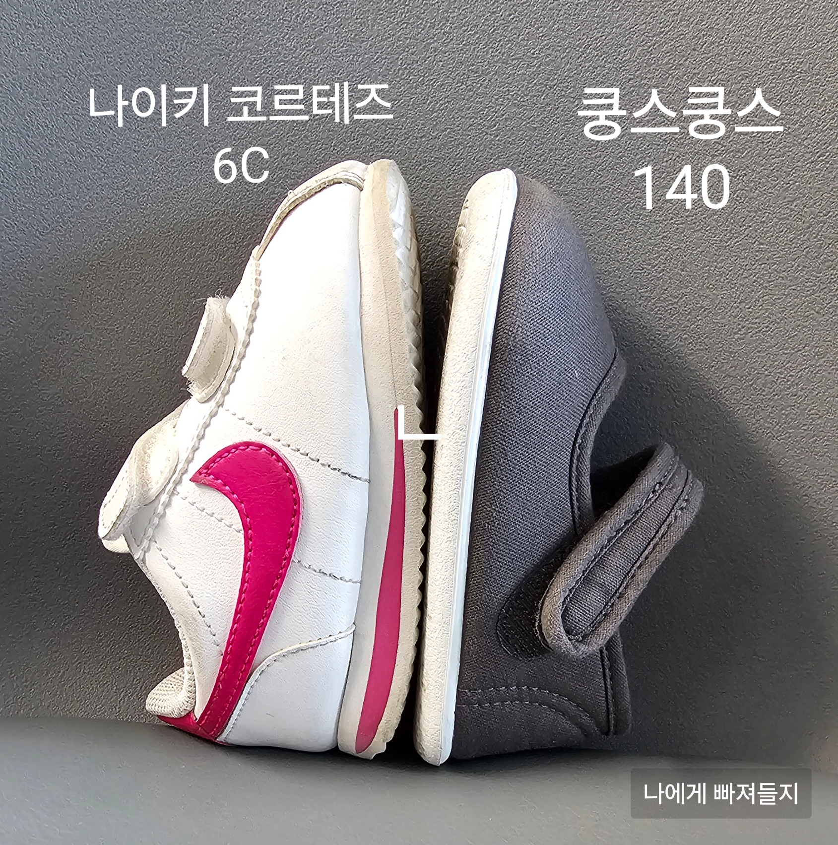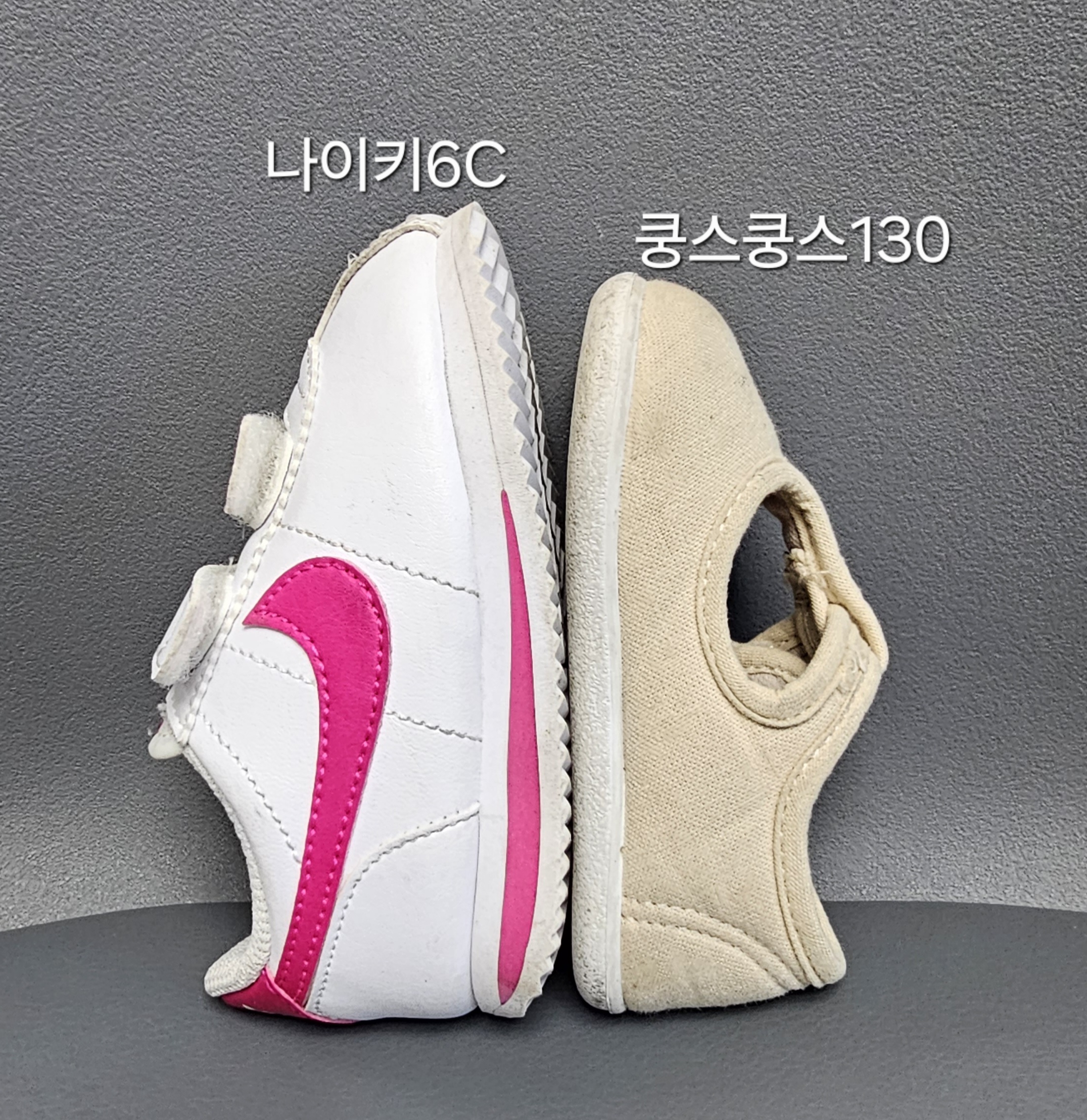 아기발사이즈 12cm 쿵스쿵스 사이즈 130cm가 딱 맞는 사이즈 였고 나이키 코르테즈가 사이즈가 좀작게나왔나해서 구매했는데, 쿵스쿵스보다 큼