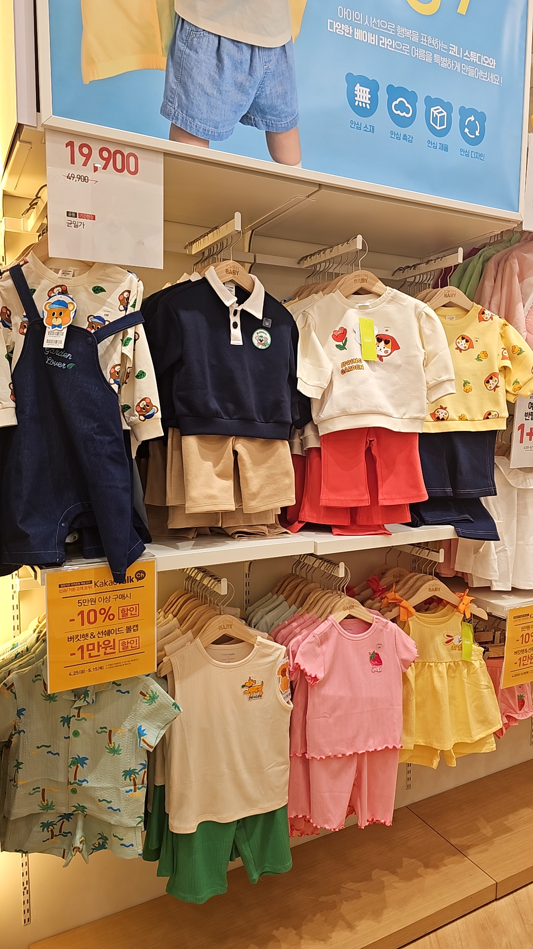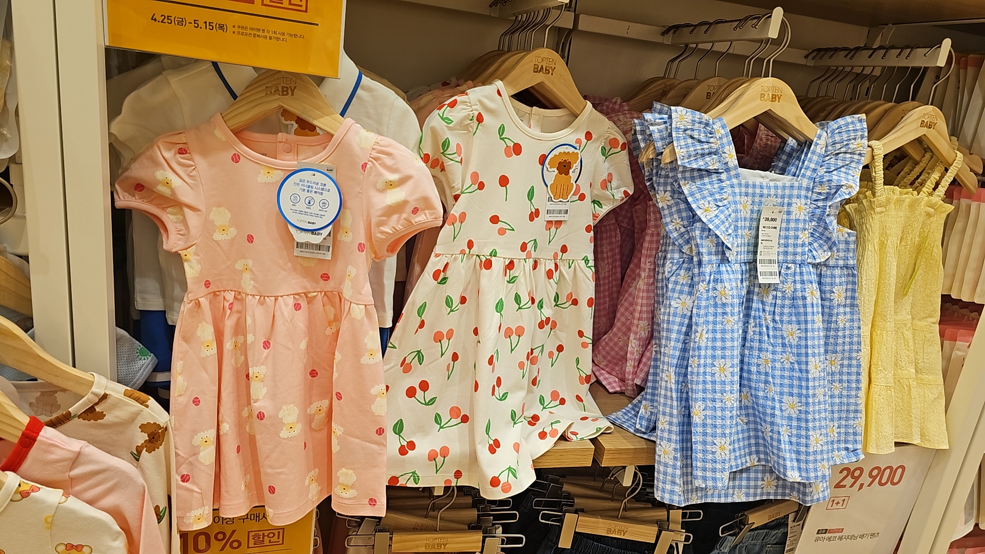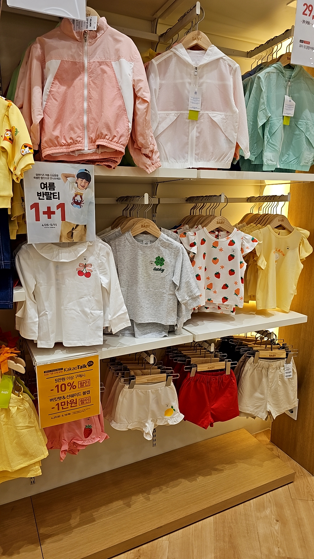 예전엔 몰랐는데 요즘에는 아가 영아 유아들 옷까지 비교적 저렴한 가격에 재질도 좋고, 세탁후에도 변형없이 잘 입을 수 있어서 구매를 하게 되는 것 같습니다. 날씨가 여름처럼 더워지는 만큼 짧은 티셔츠 원피스 반바지 등을 볼수 있었고,