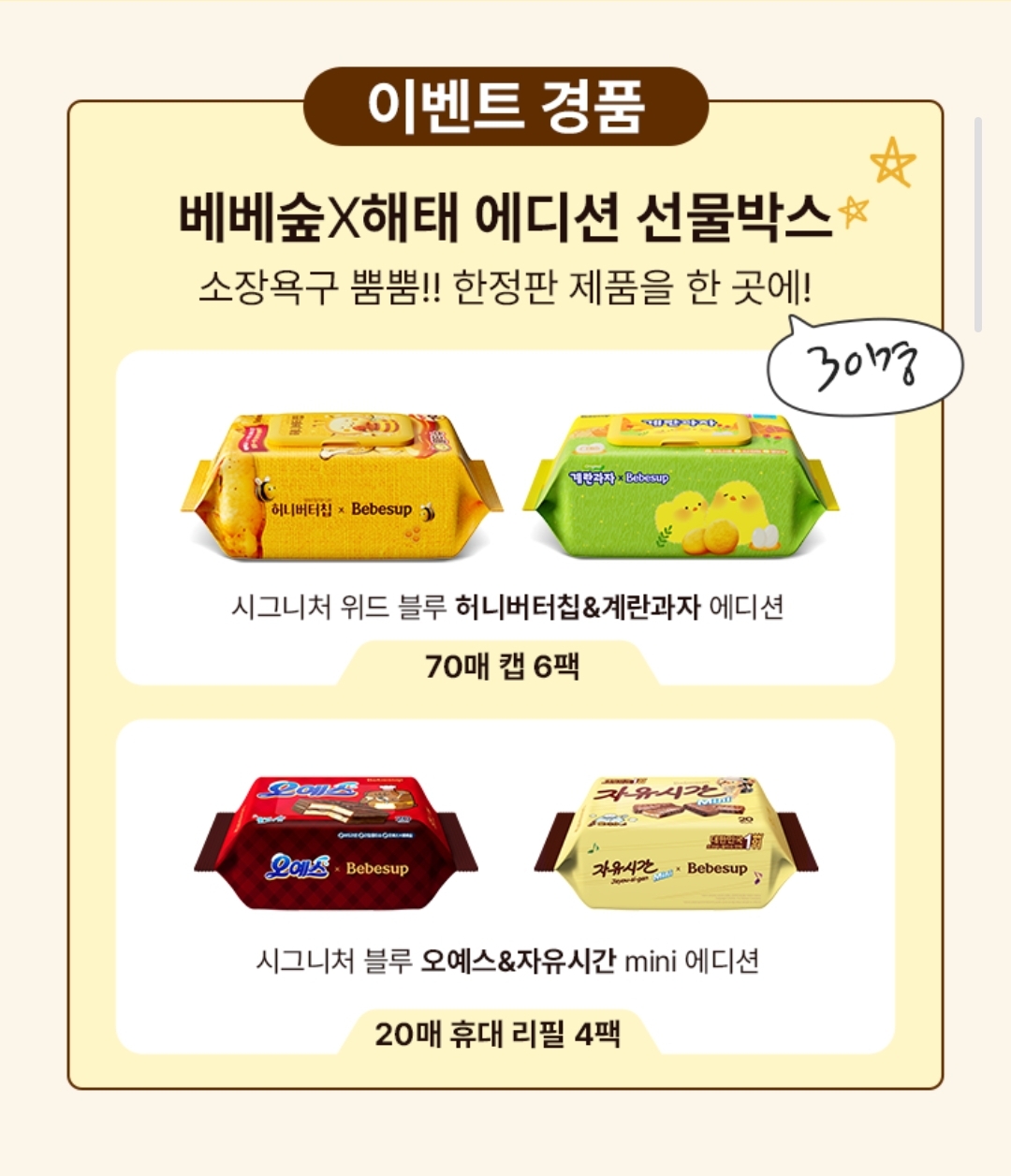 달달구리 즐겨 먹는 오예스 그리고 허니버터칩 진짜 좋아하는데 물티슈와 콜라보레이션 소장각 제대로인 베베숲과 해태 시그니처 물티슈 에디션 진심 갖고싶네요 ㅎㅎ