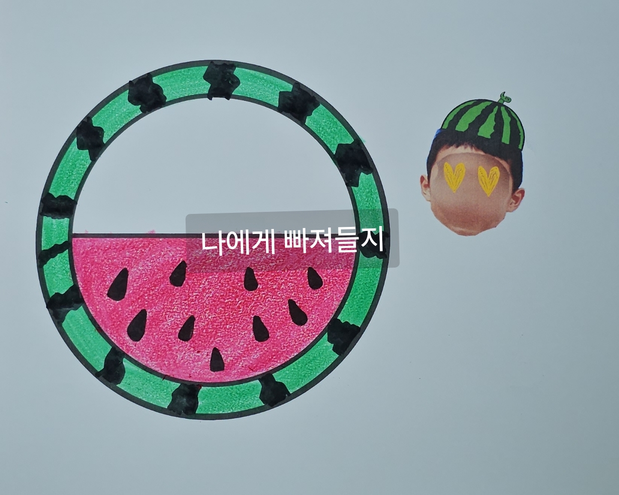 아이들의 얼굴 사진과 귀여운 수박 모자를 씌어. 합성한 후 수박 부채에 붙여줄 것입니다. 두께감 있는 종이의 수박 도안을 인쇄한 후 색칠도구 사인펜이나 색연필로 수박에 겉, 속을 색질해줍니다.