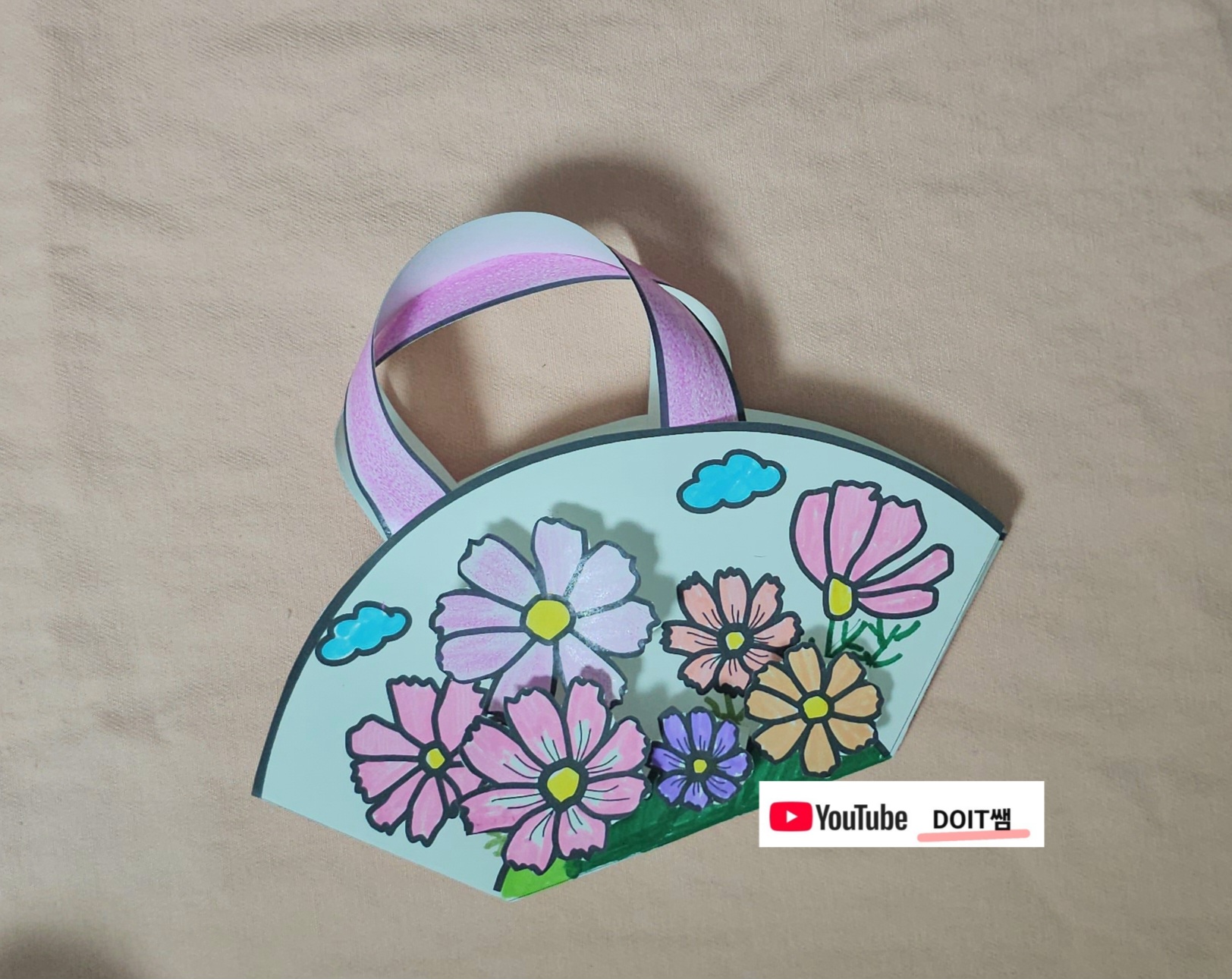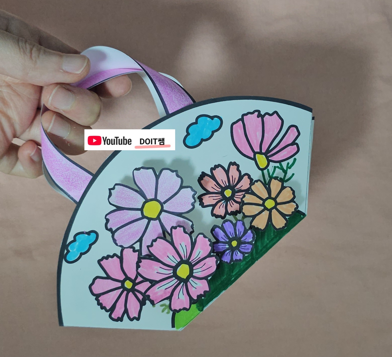 코스모스 꽃을 표현하여 만드는 귀여운 손가방 만들기 입니다. 아이들과 예쁘게 꽃은 색칠을 보고 접어보고 우려보고 소근육 발달을 도우면서