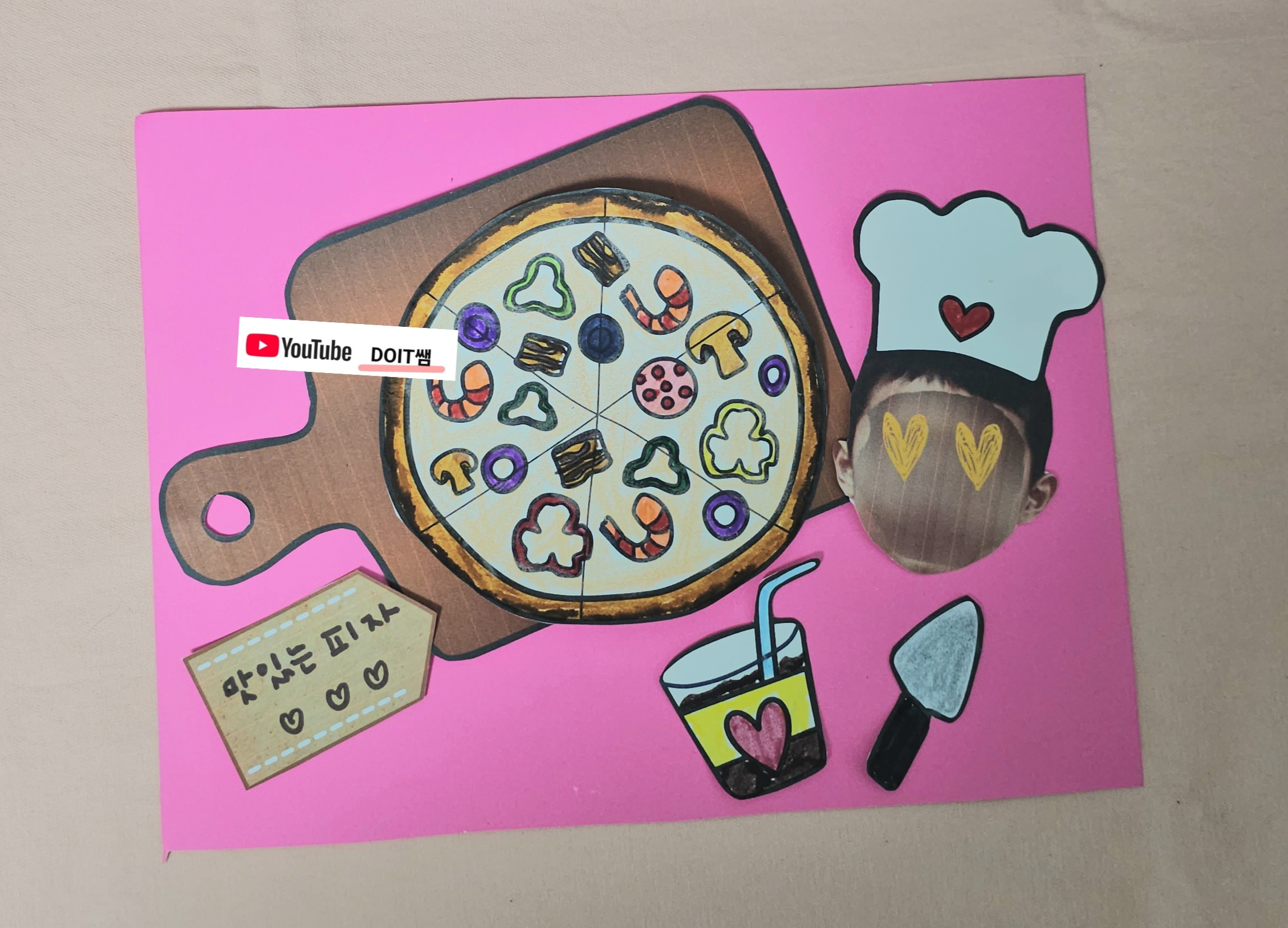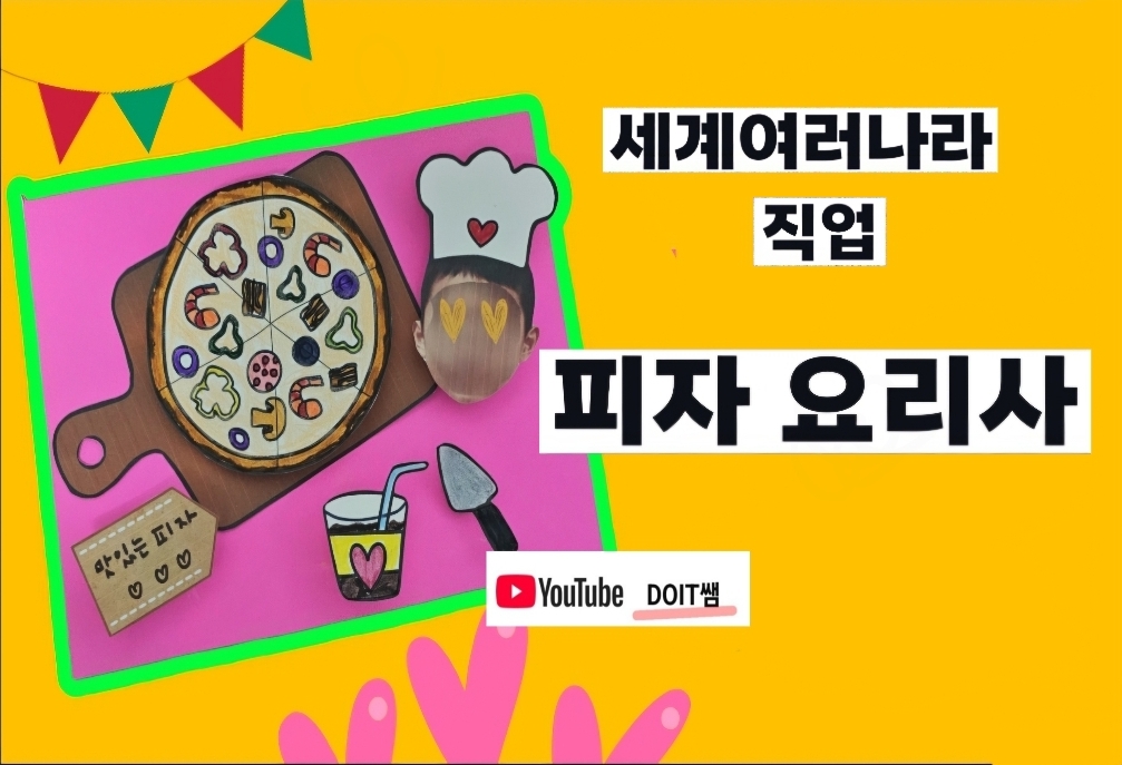 피자 밀가루 반죽 도우와, 요리사 모자, 아이들 얼굴사진 여러 가지 토핑 도안을 인쇄하여 꾸며볼 수 있습니다.