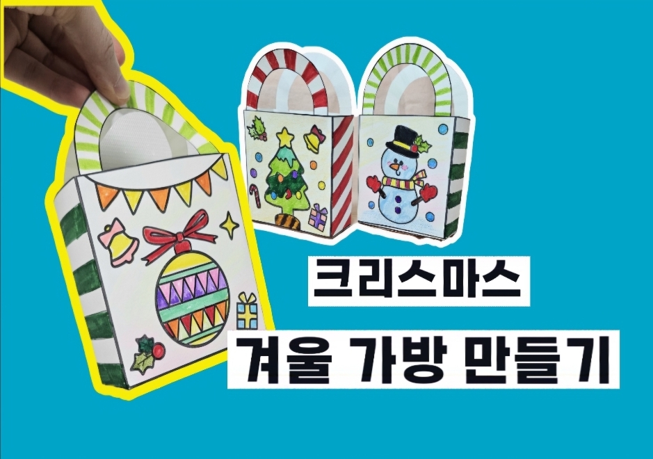 겨울 하면 생각나는 이미지를 구성하여 작은 종이가방을 만들어 볼 수 있습니다. 눈을 동그랗게 굴려서 만들 수 있는 멋진 눈사람, 커다란 나무에 알록달록 오너먼트를 달아 멋지게 꾸민 트리,