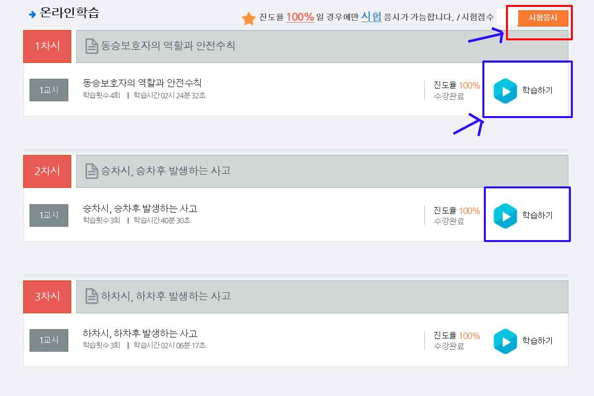 1차시~6차시 까지 있으며 동승보호자의 역할과 안전수칙, 승, 하차시, 승,하차후 발생하는 사고, 통학버스관계법령 등 온라인 학습을 마치고 나면 2시간 50분정도 소요되는 것 같아요.